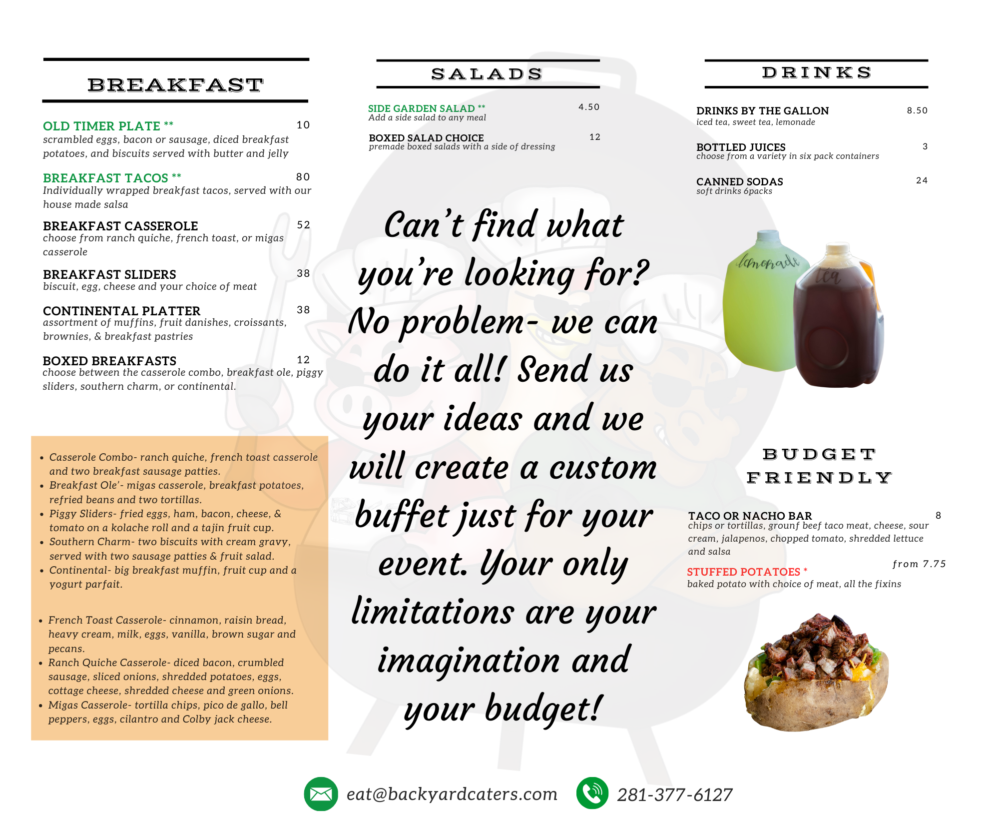YOUR BACKYARD OR OURS! ORDER NOW Can’t find what you’re looking for? No problem- we can do it all! Send us your ideas and we will create a custom buffet just for your event. Your only limitations are your imagination and your budget!